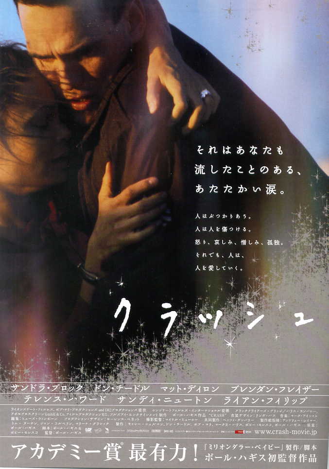 「クラッシュ」ってタイトル、自動車事故がきっかけで性的興奮に目覚めた人々を描いた作品がありました。あんまし詳しくは覚えていないんですが、サンドラ・ブロックは出ていなったよーな気がします…オープニングで彼女の名前がクレジットされたんでっと思ったのですが、いきなり作品は交通事故のシーン「触れ合いだよ・・・街を歩けば よく人と体がぶつかったりするだろでも ロスじゃ触れ合いは皆無・・・人々はたいてい車の中にいる。でも触れ合いたいのさ・・・ぶつかりあって何かを実感したいんだ。」って語りべで始まったら、間違いないって思ってしまうのも強ちではないですよねまぁ同タイトルの「クラッシュ」話はこれくらいで・・・久しぶりに引き込まれる作品に出合いましたクリスマス間近のロサンゼルスで様々な職業や人種や社会階層の人達の出来事が、次々と連鎖反応を起こすヒューマンドラマでして、もの凄くよく出来てますストーリーは余りにも多い登場人物のせいで、文才のないワタクシにはとてもぢゃないですが書けませんそして俳優陣も…男優さんからドン・チードルにブレンダン・フレイザーにマット・ディロンにライアン・フィリップにウィリアム・フィクナー等々他にも多数女優さんも前記のサンドラ・ブロックにジェニファー・エスポジートにタンディ・ニュートンにと美女勢ぞろい流石、第78回アカデミー賞作品賞受賞作品皆に紹介しても絶対ハズレって言われない自信がある秀作なんですが…あっサンドラ・ブロックのファンには勧めない方がイイかもコノ作品中のサンドラは…ホント憎たらしいです