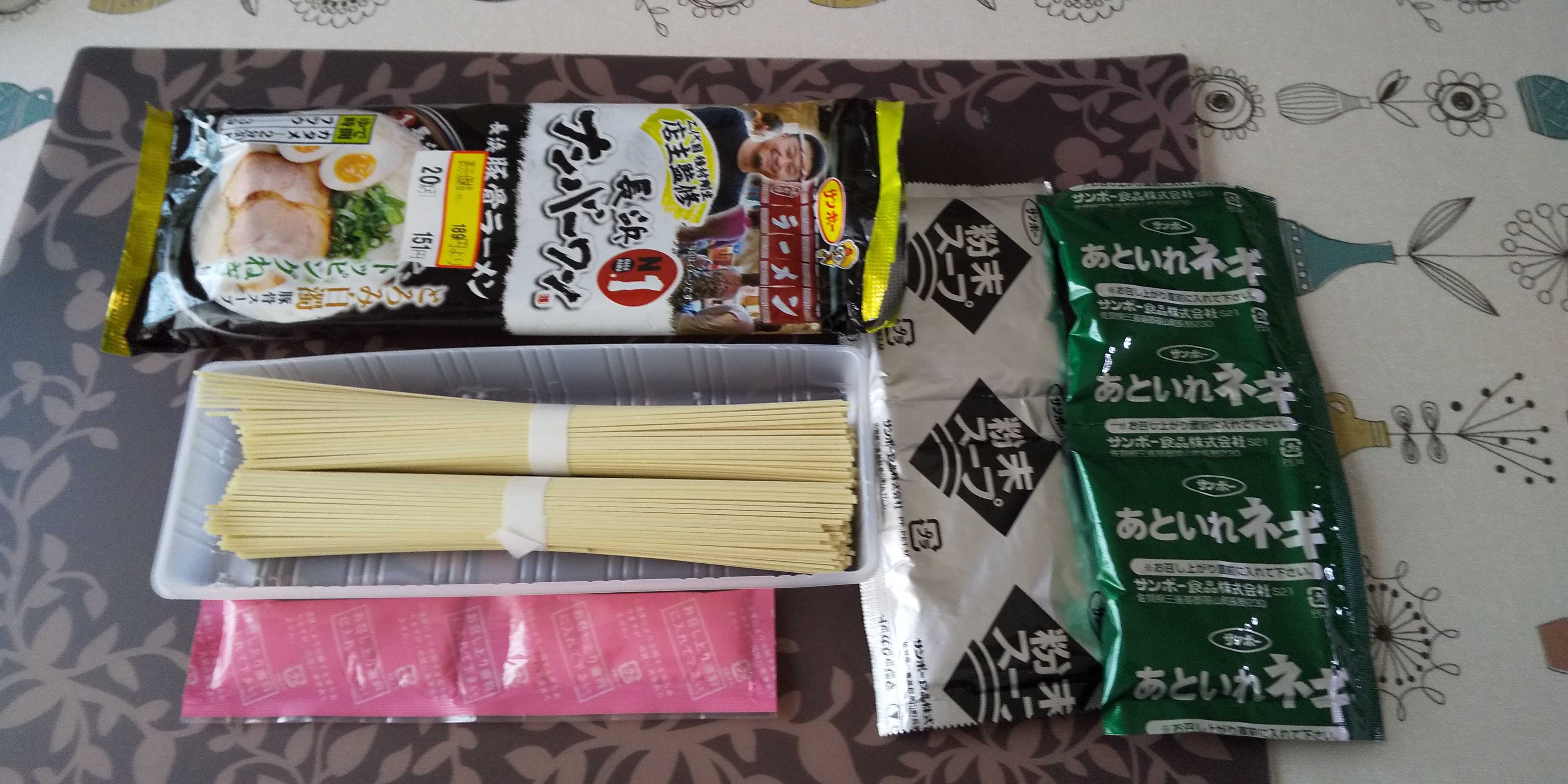 開けますと麺、スープのパウダー、脂、トッピングのネギと細い設定で入っております。