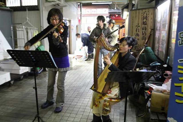 六角橋商店街のチャリティー路上ライブ、ありがとうございました!路上って、ほとんど初めてだったんだけど、とても面白かったです。何曲か聴いて、義援金を入れてくれる方がたくさんいて、なんかこう、力になれた気がしちゃいました。音楽で力になれたならこんな嬉しいことはありません。こんなに近くでチャリティーライブを企画してくださった雷神堂とMOON CATのマスターに感謝します! ★MOON CATのブログには4/1からのたくさんのレポと義援金総額が載ってます! 7日はたまゆらが映ってる~!こんな近くでなかったら身重な私が気軽に参加することはできませんでしたよ。~~~~~~~~~~~~~~~~≪ライブ記録≫ ● 4/7&18【星と樹のうた】fiddle:hazel、歌とハープ:弓歌 ● 4/15&18 古代楽器クリスタルボウル:ナナイロクリスタルボウル&voice即興:弓歌~~~~~~~~~~~~~~~~18日は最終日だったこともあって、4/1~の間何回もライブをしていた面々が集まっての何でもあり状態にもなり(笑)最終回が満月だったのは別に狙ったわけじゃないらしいです。私はラッキーだったなー!満月に2種類のライブができて、ほんとに嬉しかった。hazelさん、na*naさん、ありがとう!クリスタルボウルとは舞う方もいて。盛りだくさんでした。そうそう、お客様に絵を描く方がいて、私も描いてもらいました。これは嬉しい。以下、ぺたぺたと写真UPします!photo by 楽遊庵↑さりげなくバンジョーで参加してるたけぼーさん↑音叉を楽しむお子↓そして職務質問!!「これはどういう仕組みなんですか?」だったか…。いいキャラですなー舞う方も描く方も↓こむそうがいるのだな女子部↓