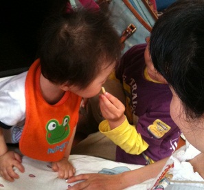 このところ食欲がハンパない児ですがちょっと前までは離乳食を湯のみ茶碗で上げていました。で先日その湯呑茶碗でガスールを溶かしていたところ「あっごはんだ♪!!!」と思ったらしく非常に興奮されました。が母がその皿から黒いものを指に付け取り出し顔に塗りたくりはじめたのでひたすら不思議そうな顔になってました。普段、母がパックをしている顔を児は面白がっているのですがこの日は不思議半分面白い半分。アロマをたさない場合はこうやって食器でも溶かしたりできるのがナチュラルコスメのいいところですねー♪参考写真: