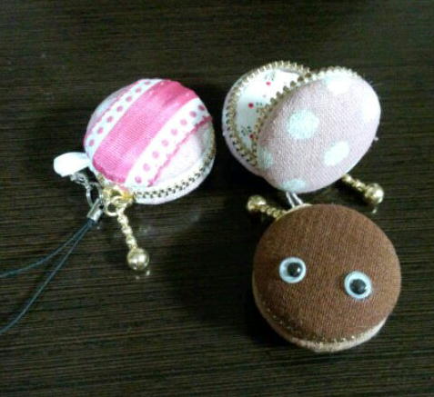 お友達が手作りしてたマカロンストラップが可愛かったのでネットで作り方を調べてみましたこれなら不器用な私にも作れそうかも・・・って思って、頑張って作ってみました♪¥500玉がぴったり入るサイズなので小銭入れに使えそうでも・・・年々視力が落ちてきてる私に針仕事は結構辛かった~1個作っただけでギブアップ写真のピンクのリボンが私の作ったものであとのは娘ちゃん作です。(^^;)ちょこちょこ何かを作るのが好きな娘は、すっかりハマったようで色々と柄を変えて、何個も製作中パパや弟、従姉妹たちに配りまくってる、この頃です