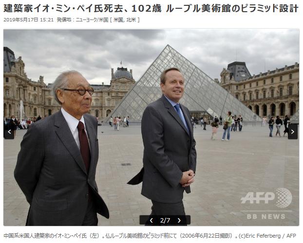 今年の正月に訪れたルーブル美術館にあるピラミッドなど手掛けた建築家イオ・ミン・ペイ氏が亡くなったニュースが流れました。102歳だったといいます。1976年に初めて訪れたルーブル美術館の広場に1993年ガラス製のピラミッドができたと聞いた時は驚きました。その後、様々なメディアで紹介され、2006年我がブログを始めた2日後の、2006年5月20日に公開された映画「ダ・ヴィンチ コ-ド」を観て、ますます、観たくなり、今年やっと実現しました。因みに、レオナルド・ダ・ヴィンチ(1452/4/15-1519/5/2)没後500年の今年、ルーブル美術館でモナリザを鑑賞し、我々のスリーショットが実現したのは嬉しく・・・。イオ・ミン・ペイ氏のご冥福をお祈り致します。FM ilovecb---------------<建築家イオ・ミン・ペイ氏が死去 ルーヴル美術館のピラミッドなど手掛ける 102歳>ルーヴル美術館のピラミッドなど手掛ける 102歳 2019年05月17日パリ・ルーヴル美術館中庭のガラスのピラミッドを設計したことで知られる米建築家のイオ・ミン・ペイ氏が亡くなった。102歳だった。ペイ氏の作品は幾何学的でシンプルな表面や自然光が特徴で、世界中で印象的な建築物を手掛けた。生涯にわたってキャリアを続け、80歳代でカタールの首都ドーハにあるイスラム芸術ミュージアムを設計した。「建築は実用的な芸術」ペイ氏は1917年に中国広州市で生まれ、18歳で渡米。ペンシルヴェニア大学、マサチューセッツ工科大学(MIT)、ハーヴァード大学などで学んだ。第2時世界大戦中には研究者としてアメリカ政府で働き、その後建築家に転身し、1965年に独立した。20世紀を代表する建築家として、さまざまな複合施設やホテル、学校、美術館などを北米、アジア、欧州で手掛けた。ペイ氏はキュビスト的なテーマを持ったモダニストと評される一方、自らが好んでいたイスラム建築からの影響を受けていた。また、ガラスや鋼鉄とコンクリートの組み合わせを好んでいたという。ルーヴル美術館の改築に伴って設計したガラスのピラミッドは、賛否両論を呼んだ。ピラミッドは1993年に公開され、現在ではパリで最も有名なランドマークのひとつとなっている。---------------【今日のLifeHack:死を前にしたとき、みじめな気持ちで人生を振り返らなくてはならないとしたら、いやな出来事や逃したチャンス、やり残したことばかりを思い出すとしたら、それはとても不幸なことだと思うの。- オードリー・ヘップバーン -(英国の女優 / 1929~1993)】<今年1月2日に訪れたルーブル、ピラミッドの前で・・><ピラミッドの下は・・・こんな感じ><ルーブル美術館内からピラミッドを>
