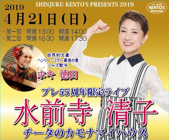 新宿駅前のライブハウス「新宿ケントス」で「プレ55周年限定ライブ 水前寺清子 チータのカモナマイハウス」。チータの伴奏を務めたのがホキ徳田さん。妻は知っていましたが、私は知らず、有名な方でした。昭和8年生まれで85歳、文豪ヘンリー・ミラーの8人目の妻として知られているようです。いまだに現役で演奏し歌っているとのこと、益々のご活躍に期待したものです。調べていたら、私の好きな夏木陽介さんと同級生のようで・・・。-------------------------Wiki<ホキ 徳田>、1937年11月14日 - )は、ジャズ歌手、ヘンリー・ミラーの8人目の妻として知られる。 エスペランティスト・NHK解説委員の徳田六郎の長女として東京上野に生まれる。本名浩子。3歳からピアノと音楽を学び、桜美林高等学校卒業後、カナダの音楽学校アルマ・カレッジに留学。級友が「ヒロコ」をなまって「ホキ」と呼んだためこれを芸名とした。帰国後、1958年にコーラスグループ[スリーバブルス]としてデビュー。日劇ミュージックホールやテレビ、映画『にっぽんぱらだいす』(1964年)などに出演する。 1966年ロサンゼルスへ渡り日本ホテルでピアノを弾いて歌っていてヘンリー・ミラーに出会う。46歳年上のミラーと結婚し、日本のマスコミを賑わすが、3年後別居、1978年離婚。 2000年に再び帰国。2010年5月から2014年12月までインターFMにて「ホキ徳田のYummy Music」のパーソナリティを務める。 現在、六本木1丁目にて、ヘンリー・ミラー メモリアル バー「北回帰線」のオーナーとして月曜日から土曜日までピアノ弾き語りをしている。 また、コンサート、ライブ活動も積極的に行っている。 2014年4月より集英社発行の月刊誌「すばる」にて「優しい友へのレクイエム」を連載。------------------------【今日のLifeHack: 人生は戯れ、万事がそれを証す。かつてそう思い、今それを知る Life is a jest ; and all thing show it. I thought so once ; but now I know it. 出典:墓石碑著者:ジョン・ゲイ】<「新宿ケントス」で「プレ55周年限定ライブ 水前寺清子 チータのカモナマイハウス」><ホキ徳田さんが立ちっぱなしで演奏したローランドの電子ピアノ><ステージで、こんな感じで演奏し、歌い・・・><このライブの1週間ほど前、4月13日にお二人はご一緒だったようで・・・><昭和42年にヘンリー・ミラーと結婚><私の好きな、夏木陽介さんとも同級生だったようで・・>
