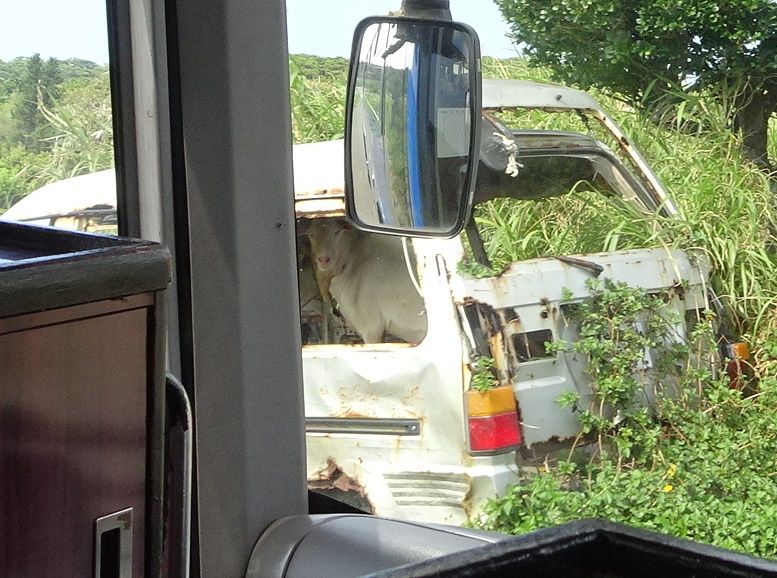 途中、ガイドさんが「廃車も利用法があります」と言って指差したのは・・・ヤギ小屋でした。