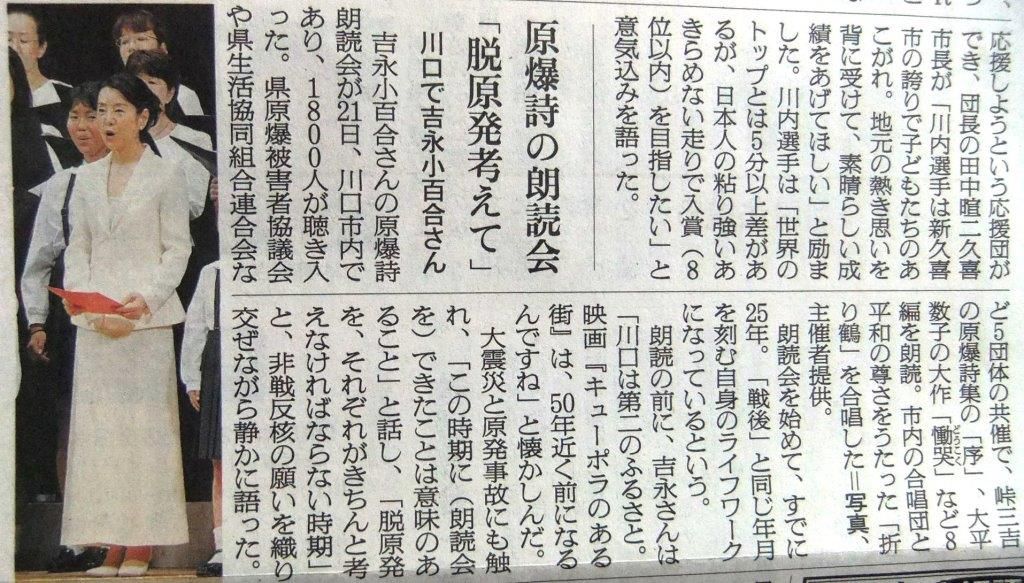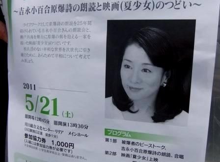 悔しい思いを胸にネットを探し回り、その後、2011年5月21日に何十年も活動し続けている「原爆詩朗読」の案内を見つけチケットをゲットしました。当日、自由席だった為、早めに並んでステージから数mの所で小百合さんを目の当たりにしたのを今でもよく覚えています。感動的な一コマでした。おきれいでした。素敵でした。朗読の中で、登場人物と同じ「父の名」を呼んで貰ったことも感動でした。何度も・・・。