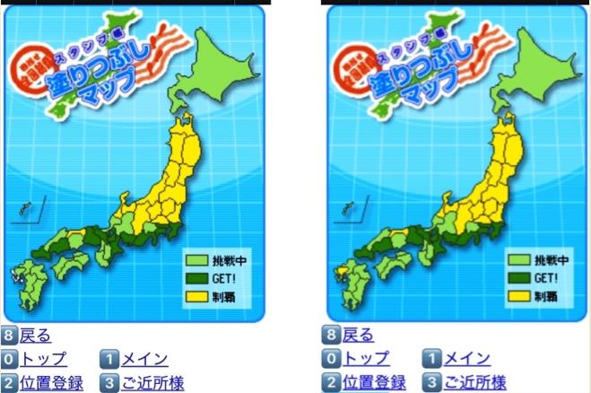 <コロプラ訪問先塗り絵、全都道府県に足跡、達成!、ビフォ・アフタ>