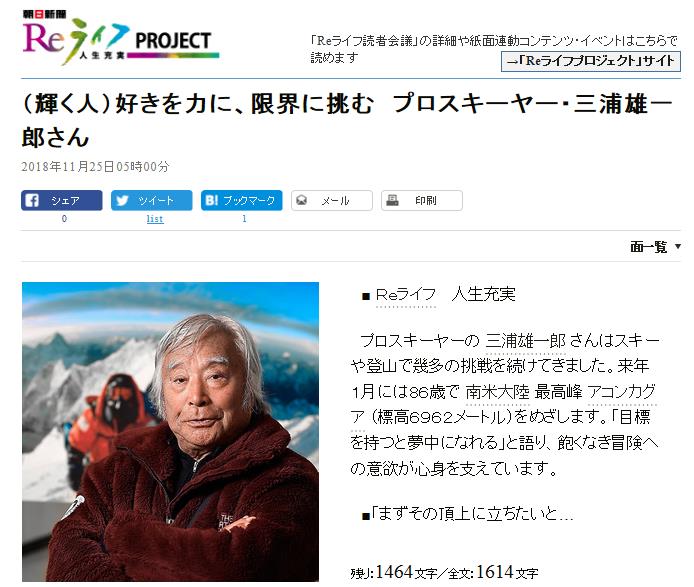 今朝の新聞「■Reライフ 人生充実」に三浦雄一郎さんの記事を見つけました。