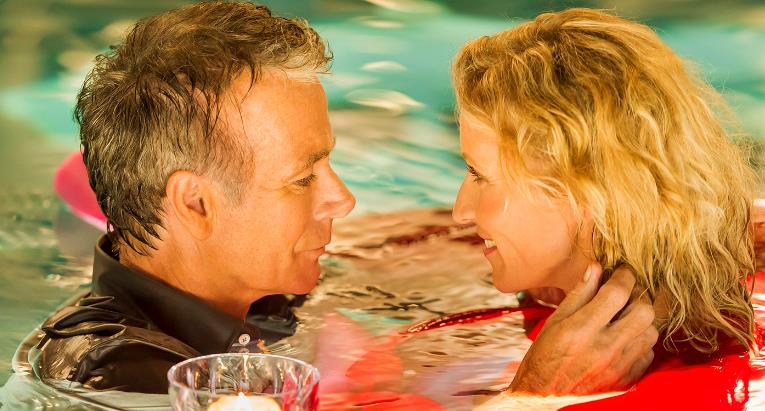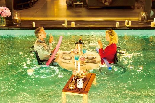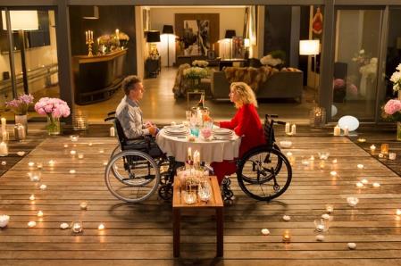 ここを舞台に二人の恋が展開、自宅で彼女とのディナーの終わりに床が下がり、当然テーブルがゆっくりと沈み、二人が車椅子のままプールへ入るロマンチックな水中デートシーンも見どころです。車いすが水底に沈み、2人は浮き上がり、重力から解放され、不自由な足やあらゆる制約から自由になる姿が描かれています。