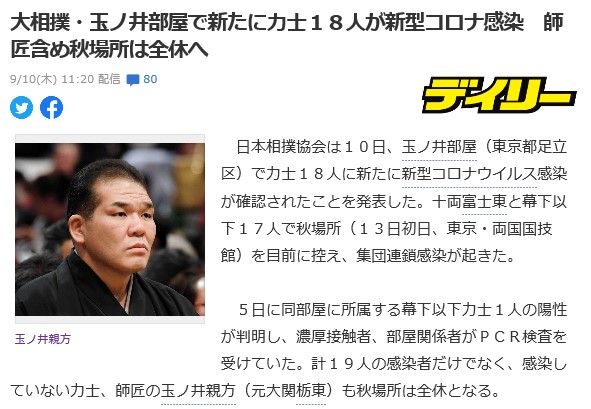 <玉ノ井部屋で19人の新型コロナ感染 親方、力士全員が秋場所休場>スポニチアネックス 9/10(木)