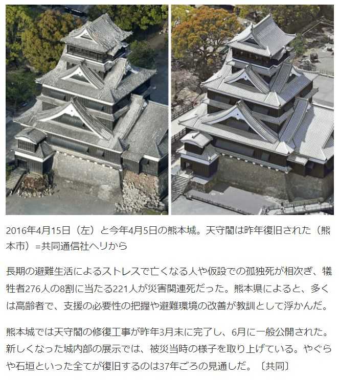 熊本、大分両県で計276人が犠牲となった2016年4月の熊本地震は、最初の激震「前震」から14日で6年となった。損壊した熊本城(熊本市)の天守閣内部が昨年、地震後初めて公開され、地域のシンボルが復旧する一方、熊本県内の仮設住宅で暮らす人は今年3月末で95人。生活再建への継続的な支援が求められている。