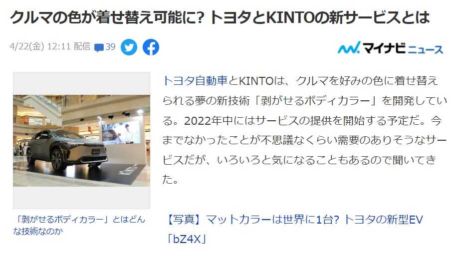 <■クルマの色が着せ替え可能に? トヨタとKINTOの新サービスとは>マイナビニュース