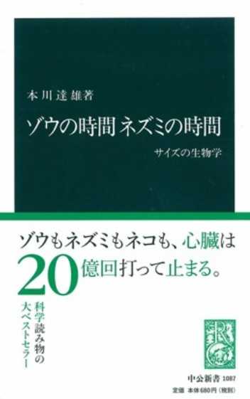 私の愛読書、生物学者・本川達雄氏の著書「ゾウの時間・ネズミの時間」(1992)に「ゾウもネズミも心拍数が20億回に達すると寿命が尽きる」という一節がある。動物は常に体温を一定に保つ為、体が小さいほど体内でエネルギーの消費が必要で、重さ3トンのゾウの心拍数が3秒に1回に対しネズミのそれは0.1秒に1回、ゾウもネズミも心臓は20億回打って止まる。
