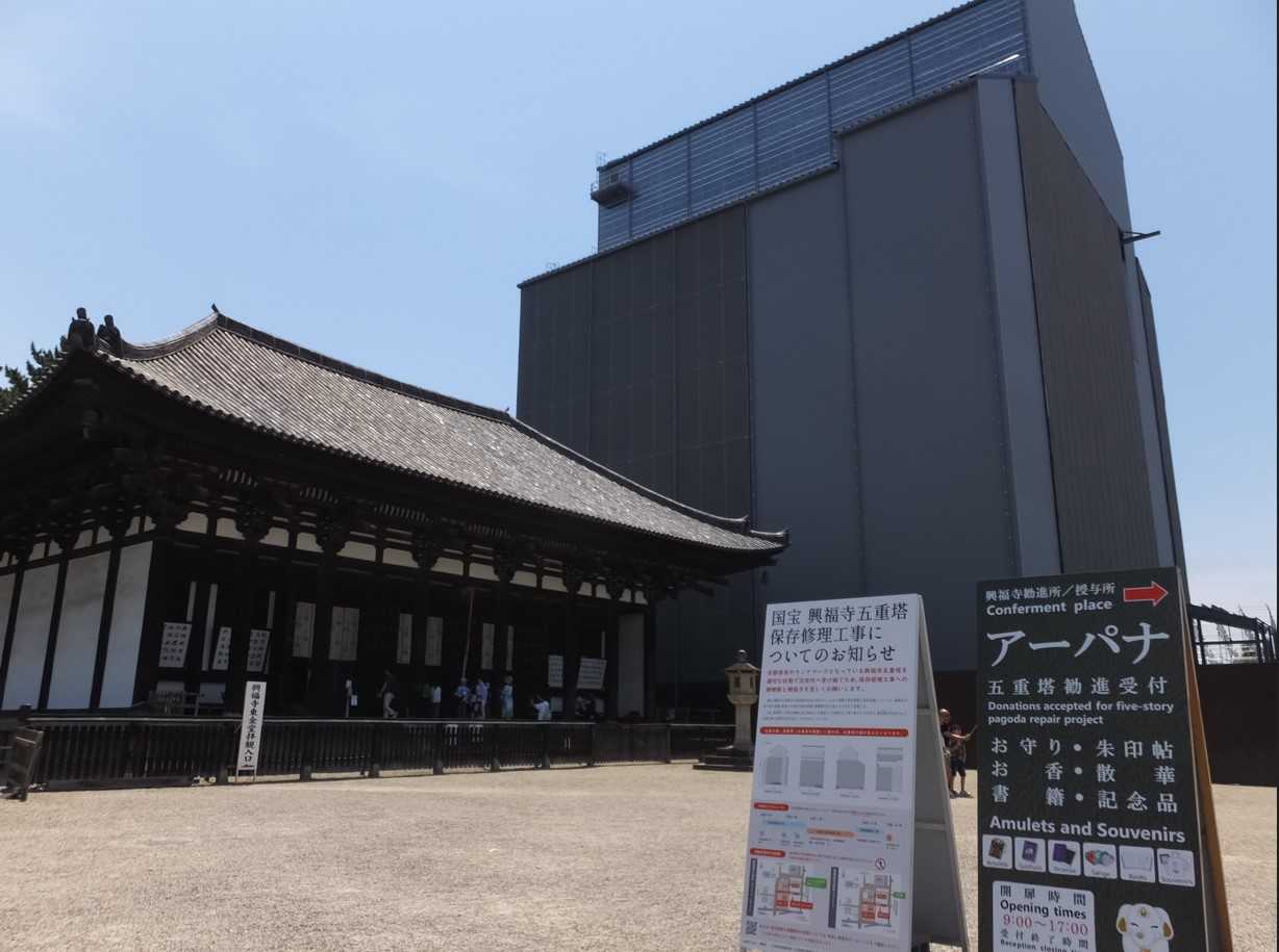 興福寺に着き、先を眺めると、なんと、五重塔が保存修理工事中、残念です。