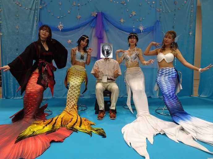 入ると直ぐに「マーメイド撮影ブース」があり、4人の美女人魚につかまります。