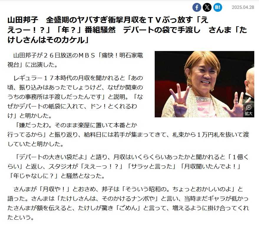 ・・・話には出ませんでしたが、以前の週刊誌ネタで、ギャラの件、月収が1億円だったことがあるらしい・・・。