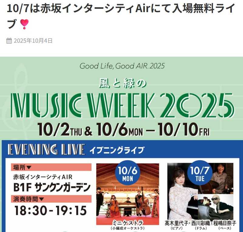 ・8 Concert Etudes Op.40 No.1 Prelude (Nikolai Kapustin) ・Days Of Wine And Roses 邦題:酒と薔薇の日々(Henry Mancini) ・Waltz à Montreal(高木里代子) ・Flight Of The Bumblebee 放題: 熊蜂の飛行(Nikolai Rimsky-Korsakov) ・One Another Day(高木里代子) ・MIYABI(高木里代子) (Encore) ・Autumn In New York(Vernon Duke) ~ ルパン三世のテーマ(大野雄二)
