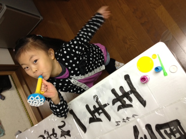 お正月といえば、おぞうにに、お年玉に、かるたに、、、、書き初め!1月2日、書き初めしました?毎年、ほぼこの日は書き初めをやります。最初は静かにやっていますが、たいてい横から口出しが始まり。。。ばばちゃんのアドバイスがだんだん発展していくにつれ、、、「もっと、ここをこうしたらいいんじゃない?」「全体のバランスが悪いよね~」っていうのを、自分のにだけコメントしていればいいものをそれぞれお互いの字をみてコメントし始めたらもお、大変なことに。。。。集中して静まりかえるはずの書き初めが、いつの間にか白熱し、わたしだったらもっとうまく書ける!って、それぞれが好きな字を書き始め、まさに「書き初め大会」でやりあうことに。。最後は三女の「わたしも書きた~いっ」って。三女の書き初めで、だいたいラストを飾ることに。で、飾ってみました姉たちはまだなっとくいかないそうで、次回への持ち越しに。今年もあつく、はげしく、、、、そして愛あふれる一年になりそうです