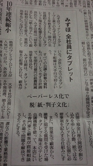 昨日の読売新聞の朝刊の記事です。全社員にタブレットかあ・・・佐賀県武雄市の学校では授業にタブレット導入だしね。時代はどんどん進む。私たちは追いついていけない。タブレットも一人に一台の時代かも。
