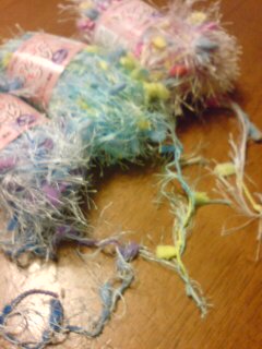 昨日、100均でアイラッシュヤーンのような毛糸が売られていました。マフラーが作れます。と書いていましたが、リボンレイで使えるよなぁと3種類買ってみました。他にも赤系、茶系のものが売っていました。ストローに3本取りで巻きつけて、夜中に3個、シュシュを作りました。「どう?」とダンナに聞くと「うーん・・・」。やっぱ、微妙ですかね・・・子供のポニーテールに巻きつけよっと。