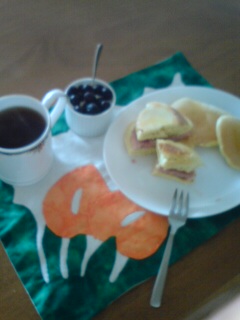 みなさんは、家で一人で食べるお昼ご飯ってどうしてますか?私はいつもは、前日の晩ごはんのおかずの残りやパスタ、うどん、ラーメンなどが多いです。(お手軽すぎる?)今日、何食べよかな~と考えてると、マックグリドルが食べたくなってきました。でも朝マックも終わってるし・・・・もどきを作ってみました。メープルシロップのかかったパンケーキにソーセージって、日本人の感覚ではちょっと・・・って思います。最初はえー・・・と思ったけど、私は意外と大丈夫でした。甘みとしょっぱい組合せで思い出すのが・・・カナダに行ったときに、カナダ人のお友達のお宅で、サンクスギビングのディナーをご馳走になりました。その時にローストターキーに、クランベリージャムをつけて食べる事に驚いて以来・・・それに通じるものがあるんですかねぇ。。。ホットケーキを小さめに焼いて、バターとメープルシロップをかけたものに、ハムステーキ用のハムをはさんでみました。コストコで1キロ買いした、冷凍ブルーベリー+ヨーグルト。飲み物は最近気に入ってる、トワイニング レディーグレーランチョンマットは一昨年のMartに載ってたキャシーさん手作りコーナーを見て作りました。ハワイアンキルトですが、キルティングなしなので、すぐに仕上がりました。