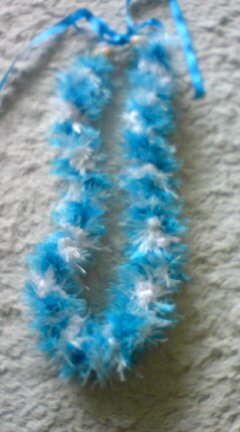 リボンレイの本に載っていた、ブルーハワイのレイを作りました。(作ったのは結構前なのですが・・・)かぎ針で編むタイプのレイです。ブルー系のアイラッシュヤーンと白のヤーン、サテンリボン白の3mmを使いました。リボンはラッピング倶楽部さんで買いました。リボンレイ作りに! シングルサテン(3mmx20m)5巻セット 小さい袋10枚付き Polu(blue)シェルリングククイナッツFUNNYヤーンFIZZクリスタルヤーンパレス