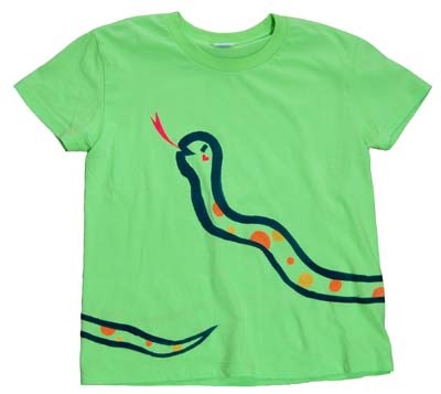 こんどはヘビさん。写真では見えないけど、緑の線以外はラメ混ぜてます。さて、洗濯したらどうなるでしょうか! 無地シャツ、残り赤1枚です。シャツと布用絵の具、買っちゃおー!