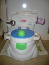今日は2度目の更新ですこちらは、我家のオマルですFisher-Priceの物で、本当のトイレを再現しているようなカワイイ物ですもちろん、トイレットペーパーもくる×2まわるし音も鳴ります。水を流す所も動かせますし、音も鳴りますトイレのフタを開けると効果音が鳴り、便座に座るとセンサー音が鳴りますステップごとに音楽が鳴り楽しみながらトイレトレーニングが出来る優れものです3番目くんは、日々がんばっております