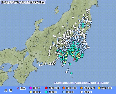 今日は私の住んでいるところはものすごい大雨でした。その影響が仕事にも出て、朝からバタバタしておりまして、今日はリーディングできませんでした。また、来週、出張があり、その準備に明日は追われますので、ブログの更新が出来なくなる可能性があります。ご了承ください。気になる地震がありましたので、それについて少し触れておきたいと思います。関東にお住まいの方はお分かりだと思いますが、東京湾を震源とする震度4の地震についてです。平成24年07月03日11時35分 気象庁発表03日11時31分頃地震がありました。震源地は東京湾 ( 北緯35.0度、東経139.8度)で震源の深さは約100km、地震の規模(マグニチュード)は5.4と推定されます。各地の震度は次の通りです。なお、*印は気象庁以外の震度観測点についての情報です。静止軌道電子は、1日だけでなく2日にも異常な推移を示していました。霊的に見れば、静止軌道電子の推移は、ヘリオスフィアの膨張と収縮に関連し、それはすなわち太陽活動の拡大と縮小によって引き起こされます。それによって、地球圏の電磁気層も、数値的に変化が生じてきます。ただ、これに加えて、地球の地磁気や造山活動も、地球圏を取り巻く電磁気層に少なからず影響を与えているというのが、前回お話したかったことです。ですから、逆を言えば、電磁気層の動向を探ることは地球の造山活動や地磁気の変化を探る手掛かりになるのだということです。そう考えていきますと、新疆ウイグル自治区で起きたM6.6や、東京湾で起きたM5.4は、今回の静止軌道電子の異様な活動と関連性があるという風に私は見ています。あと、上述したように、静止軌道電子の推移は、太陽活動そのものとも深い関わりがありますから、太陽フレアの動向などとも密接に関連してきます。現に、ここ数日は、巨大なフレアが発生しています。http://swc.nict.go.jp/sunspot/最後に、最近のちょっと気になる自然界の傾向について触れておきたいと思います。去年の3.11以来、日本で起きたことが世界でも起きるという相似象性が見られてきました。しかし、ここ最近、世界で起きていることが日本でも起きるという逆輸入パターンとでも言うべき現象を感じています。ただ、これは本当に私の主観によるものなので、本当にそう言えるのかどうかはわかりません。ですが、感覚的には、日本で起きていることが世界に伝わり、逆に世界で起きていることが再び日本でも起きるという連鎖反応とでも言うべき現象(フィードバック的現象)が、今後起きてくるような気がしてなりません。 Some rights reserved by lowjumpingfrog