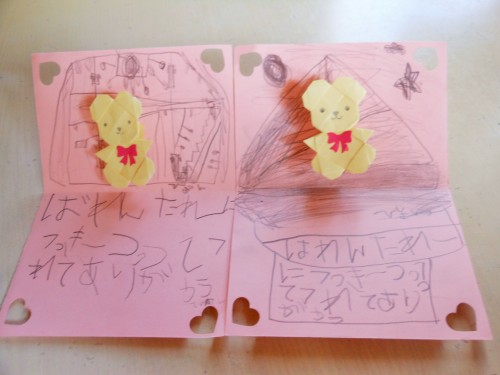 今日は、幼稚園のおわかれ会があったから、息子(6歳0か月)の友達に、ホワイトデーを渡した。息子といろんな店で見て回って、くまのチョコが2つと、王冠のチョコがひとつ入ったものを買った。メッセージカードは、この前、イベントで作った、折り紙のテディベアをつけようって決めてて、たまたま同じ、くまで統一のホワイトデーになった。カードは、四隅にハート形の穴をあけて、内側にくまをつけるところまで、私が考えた。息子が、くまが家から飛び出るところにしたい。って言うから、息子が家を描いて、そこにびっくり箱みたいなギザギザをつけたくまを貼った。カードの表はこんなかんじ。折って透明の袋に入れた。息子のお気に入り【送料無料】どんぐりロケット [ 早川純子 ]価格:1,365円(税込、送料込)【送料無料】【PHP研究所_ポイント5倍】いもむしれっしゃ [ にしはらみのり ]価格:1,260円(税込、送料込)【送料無料】ハロウィーンってなぁに? [ クリステル・デムワノー ]価格:1,365円(税込、送料込)【子育て】【6歳】