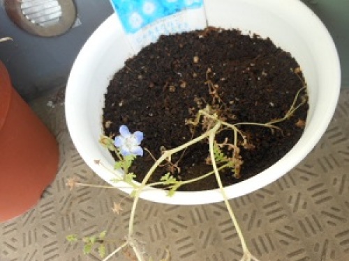 一昨日だけど、3個目の青い花が咲いた。ちょっと葉っぱが枯れかけてるけど、まだ花が咲いてびっくり。9月19日 種を蒔いた。9月28日 双葉が出た10月末 本葉が出た3月15日 ずいぶん伸びた4月6日 花が咲いた。4月10日 花が4つ。4月13日 花が6つ。4月16日 花が10個。4月24日 青い花が1つ咲いた。4月30日 2個目の青い花が咲いた。5月15日 3個目の青い花が咲いた。【ネモフィラ メモ】・乾燥気味で肥料も少なめのほうが丈夫な株に育つ。・枯れた花や葉っぱはこまめに取り除いてきれいな状態に。・葉が茂りすぎて混み合うようなら、茎を所々間引いて風通しをよくする。・日当たりのよい場所で育て、霜や凍結に気をつければ戸外で越冬できる。・乾燥気味の土壌を好むので、水は土の表面が白く乾いてから与える。・肥料は春と秋に月1~2回程度液体肥料を与える。・一年草のため、植え替えの必要はない。(病気)・灰色カビ病になると、菌による病気で茎や葉が溶けるように腐る。・茎葉が混み合ったら間引き、傷んだ花や葉っぱはこまめに取り除く。