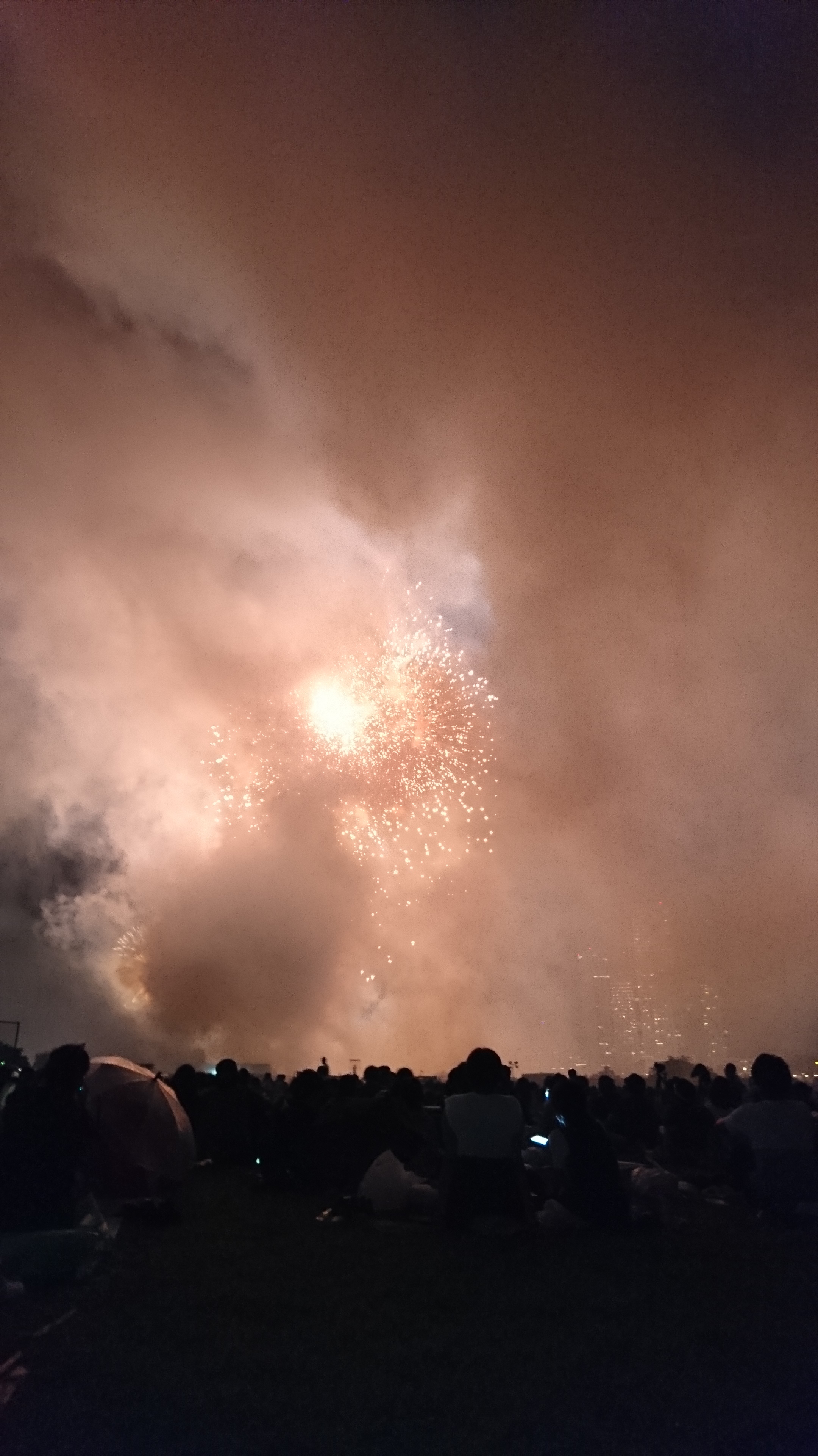 今日は、多摩川の花火大会なんだけど、雨が降ったりやんだりで、花火大会が出来るのかどうか、予想がつかない状態だった。外でも家でも食べられるように、のり巻きを作っておいた。雨の予報が少しずつずれていて、行ってから帰るまで、雨に降られないのは、難しそう。で、17時に家を出るか、17時に夕食を食べるかで、17時に夕食を食べることに決めて、夕食後、出発した。パパは歩きだから先に。息子(小学校2年生)の自転車のチェーンが切れたから、私は、息子と娘(2歳4か月)を自転車に乗せて行くことになった。自転車で出てすぐに、携帯を忘れたことに気づいて引き返すと、雨がポツポツ・・・すぐにザーザーになった。開催や中止はTwitterで分かるから、確認したけど、特に書いていなくて、パパからも連絡が来てないから、さっき持って出たレインコートを来て出発。パパは多摩川近くのコンビニにいるらしく、自転車を停めて、そこで待ち合わせた。コンビニに着いた時には、まだ雨が降ってたけど、トイレに入って、コンビニを出ると、傘を差さなくても良い感じになってた。多摩川に向かって歩いてると、花火が上がり始めた。直前に雨が止んで良かった。会場に着いて、相手る場所にシートを敷いた。もう夕飯を広げる必要はないから、小さめに広げて敷ける場所に敷いた。先週、パパの実家で手持ち花火をして、花火って存在をしっかり覚えた娘は、この花火も楽しそうに見てた♪花火は、19時から20時で、19時半とラストに、音楽が鳴って、花火がたくさんあがる場面がある。ただ今回、風の影響か、煙がすごくて、19時半のナイアガラあたりで、煙のすごさで、花火が見えないっていうアクシデントが。。。この写真は、まだ花火が見えるけど、この煙の部分が全体になっちゃった感じ。煙が赤くなったり緑になったり黄色になったりしてた。後半の花火の始めの方は、全く見えなかったけど、またすぐに、普通に見えるようになった。最後まで終わって、今日は、さっさと帰る準備。帰り、人込みで大変だから。今回は、雨で人が少なかったのもあるけど、前回、まだ混んでて進めなかった自転車置き場から、スムーズに行くことができた。