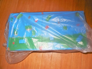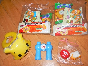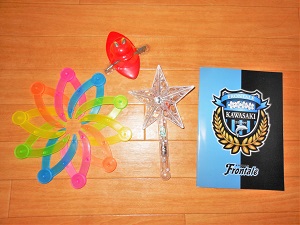 今日の午前中は、私が買い物で、パパが歯医者だったから、娘(2歳4ヶ月)は、私と買い物。息子(小学校2年生)は、歯医者に行った。パパは、歯医者の後に、武蔵小杉に用があることを思い出して、お昼になっちゃうから、マックで昼食をして、そのまま、用事を済ませに行った。午後は、息子とパパは、カラオケに行く予定だったから、そのままカラオケも行って、夕方帰ってきた。息子は帰ってくると、いろいろお土産を見せてくれた。まずは、図書館で借りた本とCD。武蔵小杉に行ったついでに、借りてきたらしい。それから、輪投げで貰ったもの。何円以上だか買い物すると、無料で輪投げができるイベントがあったんだけど、マックで食べただけだから、条件を満たしてないことを言ったら、良いですよ♪って、やらせてくれたらしい。輪を6本投げた結果、好きなものを3つ選んで良いって言われて、投げると輪が広がるフリスビーと、キラキラ光る、星形のものと、フロンターレのノートを選んだみたい。それから、ハッピーセットのおもちゃ。