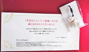 ソフトバンクの定期的に来るメールでプレゼント応募をしてる。プレゼントか、ポイントが当たるんだけど、2度目のプレゼント当選!前回は、ソフトバンクホークス優勝記念でソフトバンクの帽子を被ったぬいぐるみストラップ。今回は、普通に小さいストラップだった。紙の封筒で来たんだけど、こすれたみたいで、中のビニールに穴が開いてて、お父さんの左ももあたりが削れちゃってたのが残念。。。綺麗に配達してほしいな。。。綺麗に送りたいなら、梱包をしっかりしなさい。ってことかな?もらいものだから、特に苦情は言わないけど。