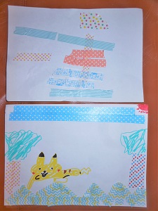 旦那の実家に帰ると、必ず付録付きの雑誌があるんだけど、その中に、マスキングテープで作る、いろんなものが載ってるページがあった。木を作ることが出来るから、全部は出来ないけど、一部を試しに作ってみた。そして、マスキングテープがあるから、それをちぎって、娘(2歳4か月)が画用紙に貼ってたら、息子(小学校2年生)も1人で作り始めた。息子は、大好きなピカチュウを描いてた。