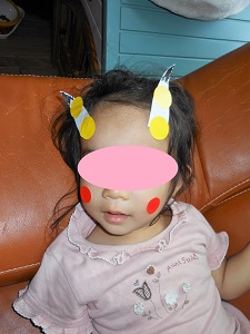 おばが、シールを出してきてくれた。息子(小学校2年生)が遊んでた。色のついた丸いシールや、動物、乗り物など、いろいろ。小学校の先生だから、子供のノートなんかに貼ったりする。2人がいない間、私と娘でシール遊び。色のついた丸いシールの赤を、私にくっつけてきたから、私が、娘のほっぺたに2個付けた。可愛い♪みんなに見せに行った。パパが「ピカチュウみたいだね」って言った。戻って息子に見せると、息子は、「もっと作ってピカチュウにする!」って言った。耳の形を切って、黄色いシールを貼って、先の方を黒く塗って、ピカチュウにした。娘に付けて、私にも付けて、自分にも付けてた。片付けように、紙にピカチュウを書いて、ほっぺと耳だけ、顔に貼ったシールを付けてた。これなら無くならない!