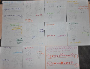 今日は、一昨日誕生日だった私の誕生日会の日。息子がケーキのフルーツなどの、いろんな組み合わせを考えてたから、その中から、千切りチョコとフルーツのケーキを選んだ。チョコが乗ってるのが良いと思って。ついでに、いつも息子が作るけど、私がデコレーションしてみたくて、私がクリームを塗ったり絞ったり、フルーツを乗せたりすることにした。息子は、フルーツを切る方にも興味を持ってたから、今回、私の代わりに、息子がフルーツの準備♪夕食は、パパがスパゲティを作って、私がサラダを作ることにした。17時ちょっとすぎに夕食が出来て、誕生日会スタート。まずは食事。それからケーキ。ロウソクを付けて、ハッピーバースデー♪ケーキは5号じゃなくて6号のスポンジ買っちゃって、1日で食べられないと思ったけど、4人であっさり完食!娘(2歳4か月)が少し残したから、明日の朝食べるように冷蔵庫へ。プログラム1の食事が終わって、プログラム2は「歌」「ひまわりの約束」と「カエデの木の歌」を歌った。プログラム3は「クイズ」いつものように、私が作った誕生日クイズ。今回は、パパの圧勝だった。プログラム4は「ルーレット」カジノやゲーセンでやるルーレットのミニ版。実家にあったのを持って来た。ルールはちょっと変えて、2つのボールがどこに入るかを当てる。ちなみにボールは、ビービー弾と同じ大きさかな?単純にして、赤×赤 黒×黒 黒×赤 緑あり(0or00が1つまたは2つ)の4つにして、好きな場所1か所に、自分の色のコインを1枚置く。当てたら1点で、10回戦。1位は私 2位パパ 3位息子娘の表も用意したけど、やらなかった。プログラム5は「おたのしみ1」息子から、バースデーカードをもらった。プログラム6は「おたのしみ2」息子の映画を見せてもらった。チャレンジの付録で、フィルムに絵を描いて、スライドにできるものがあるから。見本の絵と、背景のものと、息子の作ったものがあって、全部見た。ただ、息子は無言で見せてたから、パパが絵を見て、適当にしゃべった。影絵を見せて当てたりもした。これで、誕生日会は、終了。