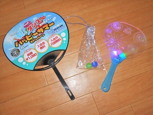 今日は、富士通ゼネラルのお祭りに行った。元々、すごく良いと、友達に薦められたんだけど、確かに、すごくいいお祭りだと思う。去年行った時、全体的に、かなり安かったから、今年は、夕食もお祭りで食べることにした。1日、お昼寝のタイミングを逃した娘(2歳4か月)は、家を出て、到着するまでに、抱っこキャリーで寝ちゃってた。始まる18時頃に到着して、自転車置き場から会場まで歩く間に、配ってたお菓子を2人分もらった♪98円とかで売ってる、駄菓子の袋詰め。先着だけど、太っ腹。そして、受付でチケットを2組。1000円分買った。チケット番号は、2107・2108・2109の連番。中に入って、まず、敷物を敷いた。場所だけ確認して、息子(小学校2年生)は、屋台を見て回って、欲しいものを考えてきた。まずは、食べ物を買った。お好み焼き(200円)焼きそば(200円)から揚げ4個(100円)焼きそばは、長い列が出来てたんだけど、前にいる男の子に、ものすごい見覚えが。年長の時に、同じクラスだった子だった。息子は、その子のことをよく分かってなかったけど、私とママは、久しぶりに話をした。あとは、娘が寝てる間にやった方が都合の良い、スーパーボールすくい(100円)をやった。息子は、大きなものを狙って、2つおもちゃをすくった。その後、スーパーボールを2つすくったけど、穴が開いて、カップまで運べなかった。席に戻って、娘を下すと、目を覚ましたから、「ご飯だよ」って言うと、すぐに起きた。「ご飯」「おやつ」の言葉で、余程のことが無い限り、簡単に動く子だから、ちょっとしか寝てないことなんて、関係ない。食べ始めると、声をかけられたから、見ると、またまた、幼稚園の年長の時の子のママだった。今度は、さっきと別の子で、パパも含む、家族で来てた。食事が終わった時点で、19時。抽選会まで、あと1時間。約束してた、カキ氷を2つ(100円×2)を買った。私も息子もイチゴ味。2人から、娘に分けながら食べた。次に、おもちゃ屋へ。1つ100円で好きなものが替える。息子は、双眼鏡の間に方位磁石のあるおもちゃ。娘は、腕に付けるプーさん。浮き輪の素材でできてるもの。席に戻っておもちゃを開けた。私が娘のプーさんを膨らましてる間、息子が楽しそうに双眼鏡をのぞいてたから、うらやましくなって、一回泣いたけど、少し遊ばせたら、落ち着いた。太鼓の演奏があって、娘がその音を気にしてたから、「太鼓見に行こうか」息子と娘は、前の方まで行って見てた。息子1人だったら、絶対前まで行かなかっただろうけど、妹が一緒だと、少し、安心するみたい。演奏は終わりの方だったかすぐに終わって、私たちは、席に戻ったけど、まだ時間があるから、少しフラフラすることにした。息子がトイレに行きたい。って言って、私も行きたいと思ってたから、会場の隣の建物のトイレに行った。戻ってくると、もうすぐ抽選会の時間。少し歩いて、席でおやつを食べたら、始まった。声が聞こえないから、前の方に行って聞いた。フロンターレグッズと、ハーゲンダッツ商品券は、大量当選だったんだけど、ハズレ。その後、みんなにとって、メインの抽選会!なんせ、1等賞は、エアコン!みんな、夢見て集まってくる。くじを引いて、いなかったら、別の人になるから、ちゃんと聞いてなきゃならない。なかなか出てこないと、みんなで5秒カウントダウンして、0になると締切り。新しい番号を引く。3等賞だかで、何だったか忘れたけど、小型家電だったかな?当てたのが、同じ幼稚園だった子で、後ろから「○○ちゃんとこだよ」って急に言われたから何かと思ったら、後ろに、さっき焼きそばのところで会ったママ。弟が、前に出てもらってた。うちは当たらずに、抽選会は終了。もう寝る時間だから、すぐに家に帰った。今日のお土産
