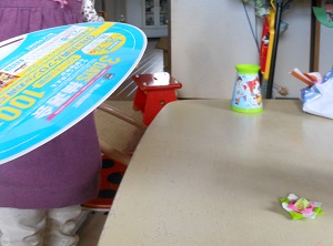 「これ、はーぷんの?」娘(2歳9ヶ月)が、折り紙で作ったコマを見つけて持ってきた。息子(小学校2年生)は、学校で休み時間に、女の子と折り紙をやることが多くて、作ったものを沢山持ってくるから、息子のものだと思ったんだろう。「それ、ママが作ったんだよ。 はーぷんに教えてもらって作ったの。 あげるから、遊んで良いよ。」すると娘は「ありがとー!」嬉しそうに、ピョンピョン跳び跳ねた。始め!手で回してたんだけど、押し入れを開けて「ママ、うちわどこ?」場所を教えたら、1つ出して、コマを仰いで回そうとしてた。当たり前だけど、まわりにあった、別の折り紙作品が飛んだ。「何でこれとこれも飛んでっちゃうの?(笑)(笑)」娘は楽しそう♪肝心のコマは、15度くらい回ったりするけど、どんどんはなれていく。私が娘の前にコマを戻すと、娘はまた仰ぐ。繰り返し同じことになったんだけど、娘は楽しそうに仰いでた。