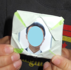 今日、息子(小学校2年生)は、いつもと同じで、休み時間は折り紙。写真立てみたいのを作ったらしく、「何か小さいの無いかな?あ、パパのがあった」前に、パパが古い証明写真を捨てようとしたのを、息子が珍しがって取っておいたもの。写真立てに入れたんだけど・・・なんだか遺影のような・・・。