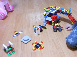 息子(小学校2年生)が久しぶりにレゴを作った。トイレ、お風呂、洗濯機、冷蔵庫、オーブン、システムキッチンを、作るように依頼されて、私が作って、車と家を息子が作った。ただ、息子は、頑丈に作るのがまだ上手くないけど、難しいことをやろうとするから、途中で私が補修。家とレストランが一緒になったもの。「回るテーブルだよ」って息子が言うから、「回るテーブルと言えば、中華料理屋さんにこんなのあるよ」私が作ってあげると、気に入ったらしい。それも採用された。なのに、テーブルの下の段の回らない位置に椅子を付けた息子。「これじゃあ、自分のお皿も一緒に回っちゃうじゃん。 そうならないように、2段になってるんだよ」って言った。「回す時に『はい、自分のお皿持って~』って言って回せばできるよ」「そんなの、落ち着いて食べられないよ(^^;」その後、椅子を下に置いて、普通の回るテーブルになった。もうだいぶ出来たけど、まだ、細かい場所を作るらしいから、出来たものだけ、机の端に置いておいた。