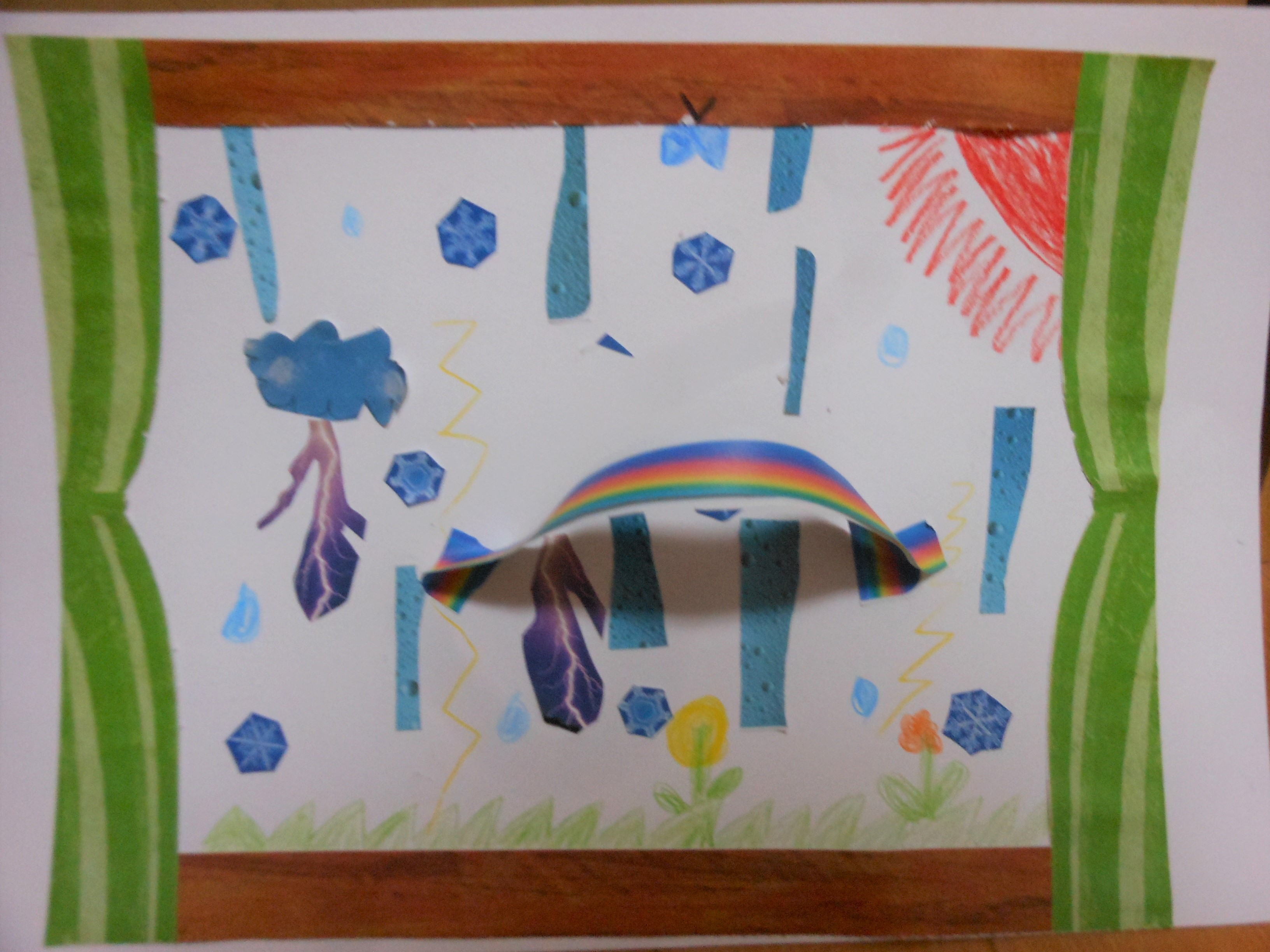 今月のチャレンジの工作は「ふしぎの国の天気」天気に関係ある模様を好きな形に切り取って使ったり、背景を描いたりして、窓から見える景色を完成させるもの。晴れているのに、雪、雨、雷、虹がある、不思議な場所にした。こんな天気だけど、綺麗な花と草がある。