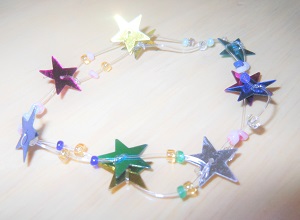 冬休み直前に、息子(小学校2年生)が、星形のスパンコールを持って来た。息子の好きな子にもらってきたもので、「ブレスレット作ってあげるから」って言ったらしい。冬休みに作ろうと、息子が作りやすいように、ビーズ用の糸を買ってきた。ゴムのように伸びるののほうが、切れにくいし、使いやすいかな?って思って、買った。これ買ったの、小学校以来かもしれない。冬休みは、クリスマス、大掃除、パパの実家、私の実家で、空いてる日がほとんどなく終了。近いうちにやらなきゃと思ってたけど、「ママがやって」作り始める前に、諦めた息子。ホワイトデーであげるのもアリかな?まだバレンタインも貰ってないけど、そう考えたら、優先順位ではなくなり、息子の誕生日後、作ることにした。つまり、11日、12日の誕生日連休の後の今日。少し前から、星のスパンコールだけで、どんなものを作ればいいか、良い案が浮かばず、3月に入ってからずっと考えてて、やっと決定!今日、朝から試しに数個やってみたら、間にビーズが入ったら可愛くなると思って、ほどいて作り直して、完成!作ってるところにいた娘(2歳11か月)が気に入っちゃって、まずは付けてみた。息子が帰って来て、見せてみると、「可愛い~♡」喜んでくれた。このまま入れるより、お店で買う時みたいに、厚紙にくっつけておいた方が良いかな?と思って、「メッセージ書く?」って聞いたら、「書く」って言うから、B6の色画用紙を半分に折って、上半分に文章。下に、切り込みを入れて、ブレスレットを付けた。