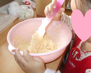 昼過ぎ、娘(2歳11か月)が、「おやつ食べたい」って言いだした。いつもおやつを食べたい娘。オーブントースターで簡単に出来るクッキーないかな?調べて、作ることにした。混ぜる手伝いを、いつもやりたがるし、おやつ食べたい病も、止みそうだし、なにより、お菓子のストックが、ミニドーナツしかない。うちは、数種類の個包装のおやつから、好きなものを2つ選んで食べるんだけど、選ぶものが無くなっちゃって(^^;とりあえず、ほとんど混ざらないから、私が基本混ぜて、娘にも形だけだけど、混ぜてみてもらって、満足してもらった。マーマーレ―ド入りのクッキー。帰ってきた息子(小学校2年生)にも気に入ってもらえた。夕方、娘が「またクッキー作りたい!」って言ってた。最近、料理が楽しくてしょうがないみたい。そう言えば、息子も、これくらいの年齢から、楽しそうにやってたな。