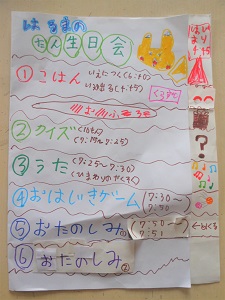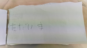 先週息子(小学校卒業)が、家に帰ってきた時に、玄関のドアの郵便受けに何か入れたから、それを私が取って、息子に促されて見た。「ただいま」折り紙にひとこと、書いてあった。学校で作って来たらしい。そして今日は、帰ってきて、私がドアを開けると、紙を見せてきた。「ただいま」今日は分厚い。折り紙を半分に切って、本のようにテープで留めてる。「今日、言うこと全部書いてきたから、 ママからは何も言わないでね」って言う。だから、雑談とか、紙に書いて無さそうなこと以外は、何もこっちから言わない約束をした。手を洗ってすぐに見せてきたのは「おやつ食べよう」他には「そうじやるからビニール袋ちょうだい」(ベランダ&玄関掃除のこと)「きょうのべんきょうなに」「きょうのごはんなに」「ゲームやるね」「ごちそうさま」「ドラえもんの本をよもう」「おやすみ」「ごちそうさま」があるのに、何故か「いただきます」が無い(笑)「ごちそうさま」は出し忘れてたし(^^;