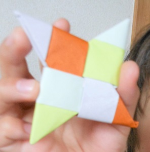 今日も息子(小学校2年生)は、学校から帰って、休み時間に作った作品を見せてくれた。新しいデザインの手裏剣。初めに折る向きを変えてみて、裏の白い部分も出るようにしたらしい。折り紙のハートとか、いろんなデザインがあるけど、息子はそういうパターンがあることは知らなくて、自分で考えて作ったらしい。