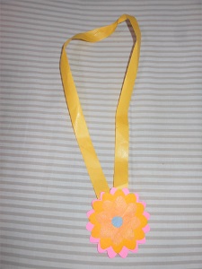 今日は、子育て支援センターで工作があるから行ってきた。小学校が12時に終わるけど、娘(2歳11か月)は12時過ぎの園庭遊びも好きだから、それが出来ないのを想うと、行くか迷ったけど、「今日はお庭では遊べないから、中で遊ぶよ」一応、念を押して行った。到着して、早速工作。今日は簡単。まず、先生に、ペンダントのひもを、娘に合わせて切ってもらった。そして、それぞれの大きさから1枚ずつ、好きな色の花びらを選んで、それを貼っていくだけの作業。最後に先生の所に持って行って、さっき切ってもらった紐を付けてもらって出来上がり。