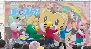 今日は、映画「しまじろうと にじのオアシス」公開記念で、二子玉川にしまじろうが来る日。娘(2歳11か月)を連れて行くことにした。今までは、電車で行ってたけど、自転車でも行ける場所だから、自転車で行くことにした。地図上で距離を見たら、普段、余裕で行動してる距離内だった。多摩川越えるから、遠い気がしてただけ。。。9時半に出て、のんびり進んで、途中、パパから2回電話が来たから止まって電話したけど、ライズの駐輪場に停めて出たら10時になった。道は分かったし、スムーズに行けばもっと早く着く。今までも、しまじろうを見に行ってるけど、開始30分前に到着してたら、もう、後ろの方に座る状態だったけど、開始55分前到着で、まだ前半分が埋まってない状態だった。入口に向かってると、息子(小学校2年生)くらいの年の男の子とお母さんが歩いてて、お母さんが「しまじろうだ。見ていく?」って言ったら、「見るわけないじゃん」って言ってた(^^;息子も今回は「行かない」って言ってたし、小学校に入った頃までが限界かな?真ん中の通路の所に座った。前が見えなくても、通路から顔出せば見れるから。始まるまで50分ほど。待ち時間が長いから、おにぎり持って来たんだけど、娘が飽きるまでは、それは言わないでいた。少し経って、後ろの人が「おやつ食べようか」って言ったら、「おやつ食べたい」って娘も言った。「おにぎりあるけど食べる?」「おにぎり、食べたーい!」ってことで、おにぎりを食べた。しまじろうの前と後に食べようと思ってたけど、全部食べちゃった。その後は、私の膝の上でジャンプしたり、べたべたくっついてたり、お話ししたり。娘は、面白いから、結構早く時間が過ぎた。良く知ってる音楽が鳴って、お姉さんが出てきて、しまじろう、みみりん、とりっぴー、にゃっきーも出てきた。娘は大喜び。しまじろうのわお!で聞く歌と、みんなの知ってる童謡と、たくさん歌って楽しんだ。真ん中の通路に出てた子供を見て、娘も同じように通路に出るんだけど、3回くらいジャンプすると、すぐに戻ってくる。まだ、離れるのは不安らしい。隣だけど。ほとんどを、私の太ももの上でジャンプしたりしてた。太ももに痩せるツボがあったら最高だったのに。。。途中から、だらーんとしたりして、疲れてたっぽい。最後のバイバイは、ずっとやってた。終わって、花のオブジェを少し見て、高島屋へ。駐輪場は3時間までが無料だから、高島屋の方に移動。高島屋は、車で来る人が多いっぽくて、自転車置き場が裏に追いやられてる感じ。こえだちゃんの人形買おうと思って、おもちゃ屋へ。でも、こえだちゃんは無かった。おもちゃ屋では、ブロックとか木のおもちゃで遊んだ。その後、屋上庭園に行って、ここでもたくさん遊んだ。子供が遊んでる坂があって、そこを寝転がってころころ降りてきてた子供たちがいて、娘も気になったみたいで、寝転んでコロコロ。ただ、みんな上から下に降りてるのに、娘は下から上にころころ行こうとして失敗(笑)屋上では、たくさん走ったり歩いたりして、「アイス食べたい」って言って、終了。自転車出して乗せると、すぐに寝た。もう疲れてたらしい。アイスは食べずに、家の近所のクリエイトまで行って、カートに乗せる時に起きた。買い物を済ませて家に帰っちゃったから、家で、凍らせておいた、フルーツ缶詰めのシロップを出して、包丁で角切りにしてだしたら、喜んでくれた。今日はたくさん楽しんだけど、クリエイトでの普通の買い物以外、全くお金を使わずに楽しんできた♪
