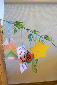 明日の予定はと思ってカレンダーを見たら、「笹持ち帰り」って書いてあった。幼稚園の製作の笹を持って帰ってくる日だ。うちの季節の飾りは今、アジサイになってるけど、そろそろ笹にしようと思ってたところ。笹を出して飾りつけ。今回は娘(幼稚園年中)も一緒にかざった。みんなの願い事も書かなくちゃ。娘は先に一人で書いた。パンやさんとハンバーガーやさんと人魚になりたい。って書いてた。