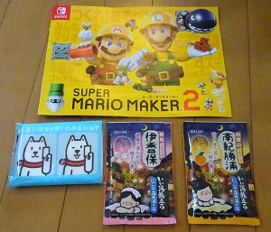 ビックカメラは土日にイベントをやってることが多いから、息子(小学校5年生)はパパが行く時に必ずついていく。今日は娘(幼稚園年中)が近所の公園で遊びたがって、昼過ぎに少し遊びに行ったんだけど、息子はそこに興味がなくて留守番。パパがビックカメラに用があったから、娘が帰った来た後、息子を連れて出かけて行った。ゲームをしたりして、お菓子とか試供品とかもらってくる。「今日はこれだけだった」息子が見せてくれたのは、入浴剤2袋とポケットティッシュ。あとは、今月だか発売の(たぶん)マリオメーカーのパンフレットをもらってきた。息子はゲームのパンフレット大好き♪