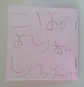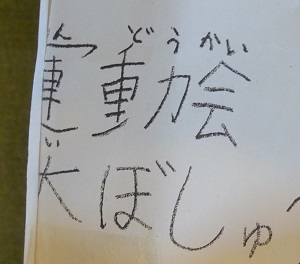 今朝、娘(幼稚園年中)が漢字を書いてた。「見て、これ書いた!」昨日娘は、去年か一昨年あたりの学校の運動会のキャラ募集の手紙で、箱を作って「宅配」って言って手紙を運んできたんだけど、その見えてる部分の漢字を書いたから、「運」がちょっと切れてる。(手紙の箱)(娘の書いた字)「うんどうかい?すごいね、漢字書けたんだね」そう言いながら見た娘の書いた「ふりがな」に違和感。「うんどうかい?あ、こはる、いかうどんかと思った。 いかがのってるうどんかと思ったよ!」「いかうどん」って(笑)ふりがなの違和感に納得。